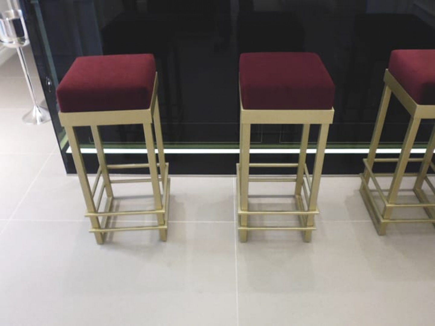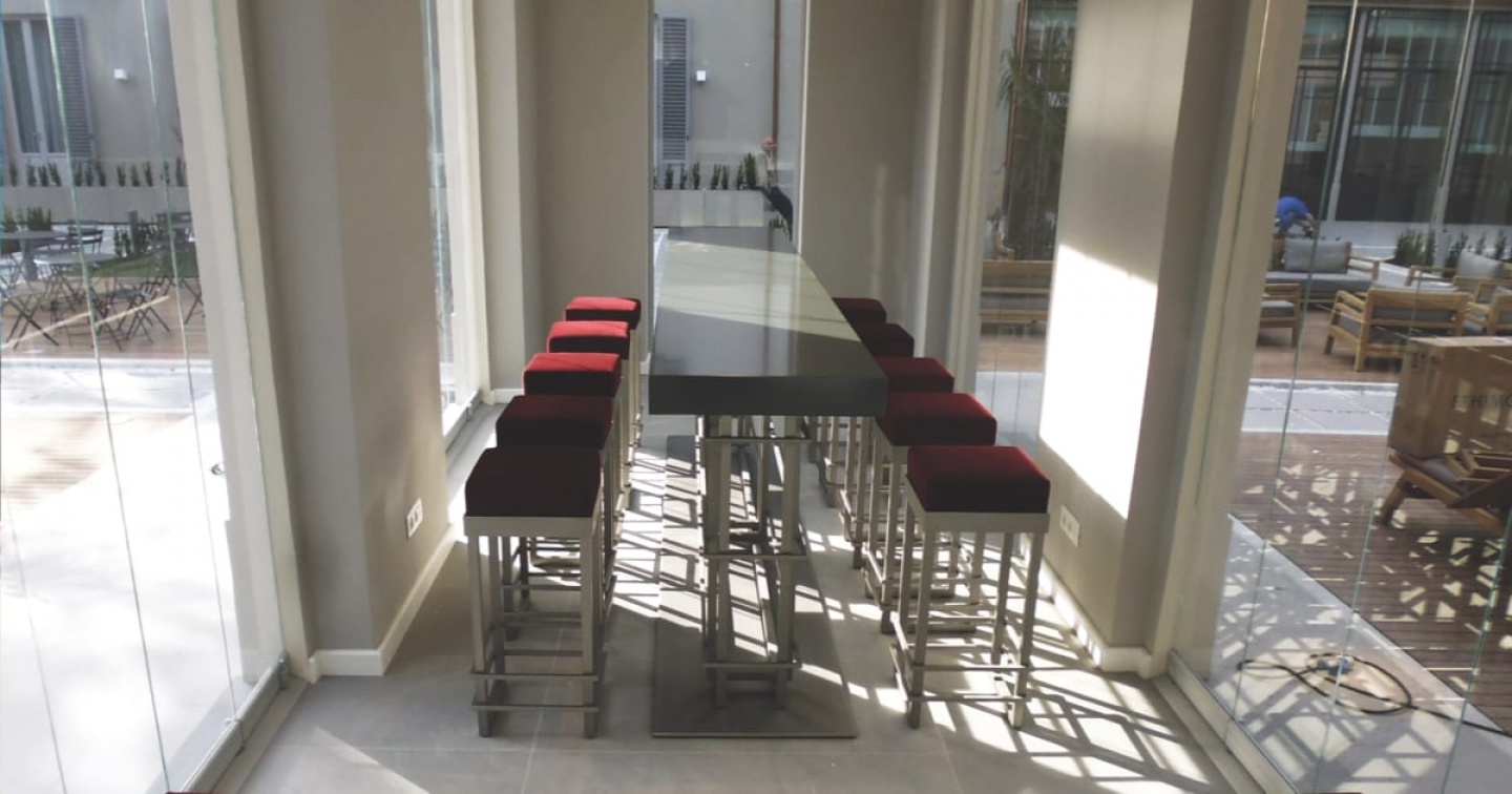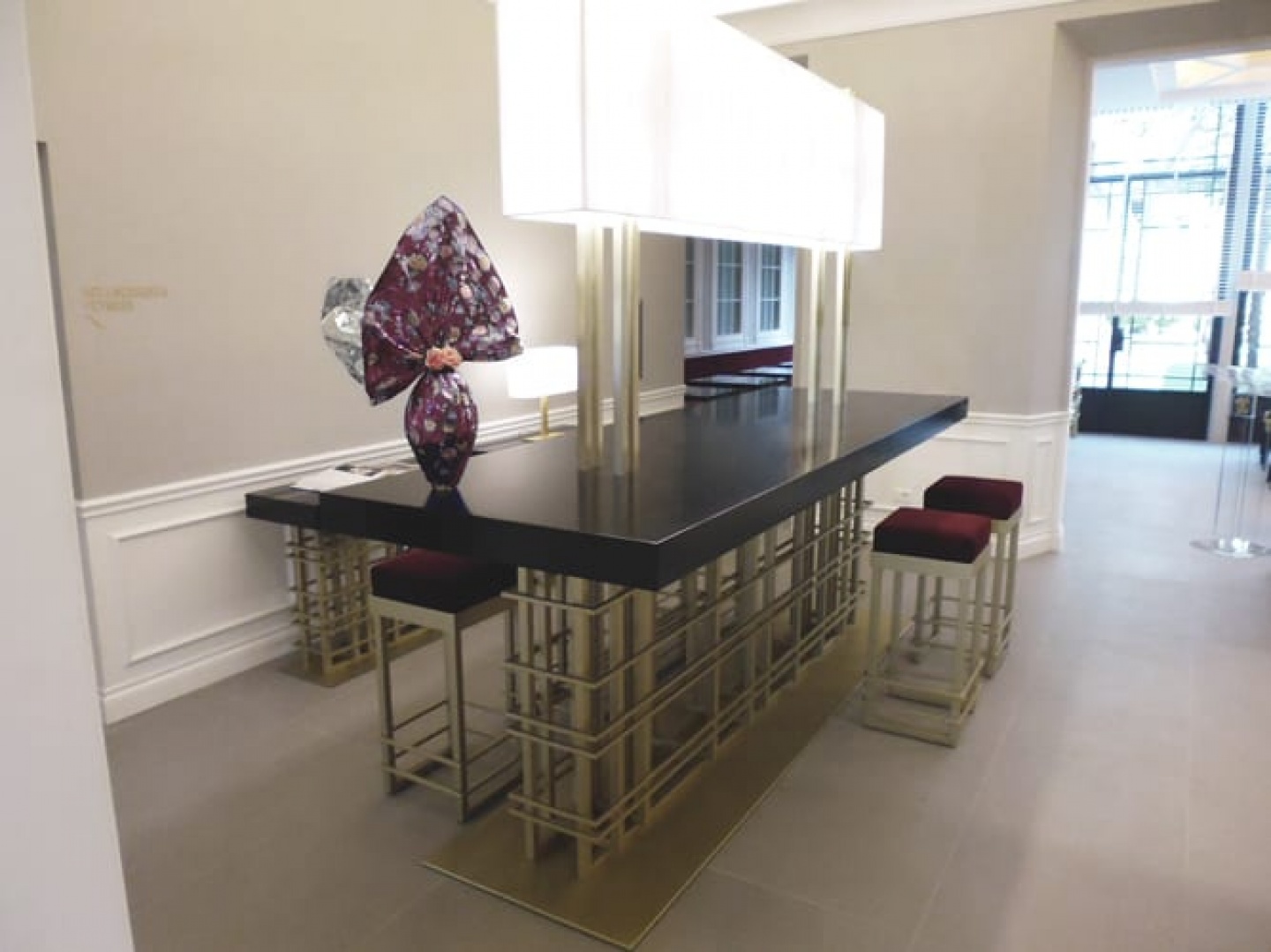 Sgabelli, tavoli e consolle sono stati progettati e realizzati per integrarsi e dialogare perfettamente con lo stile raffinato dell’hotel, fra il classico e il moderno.
