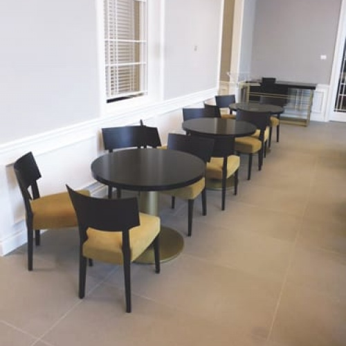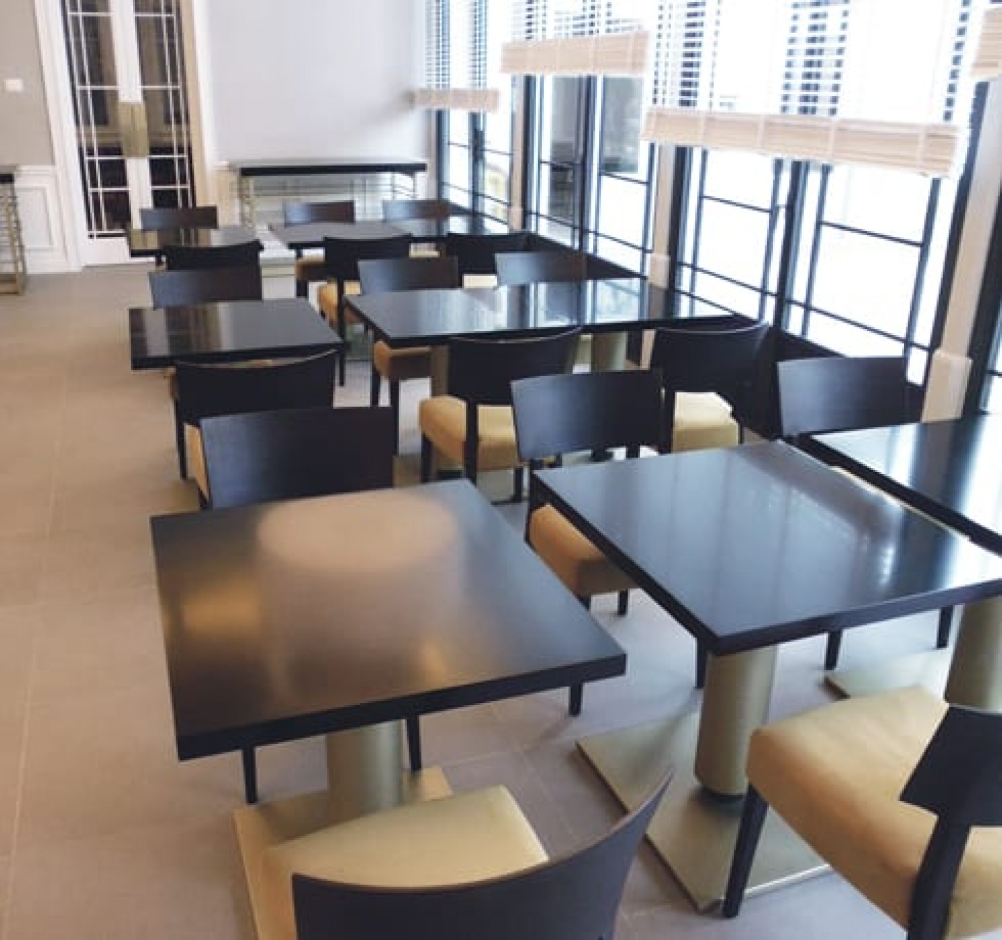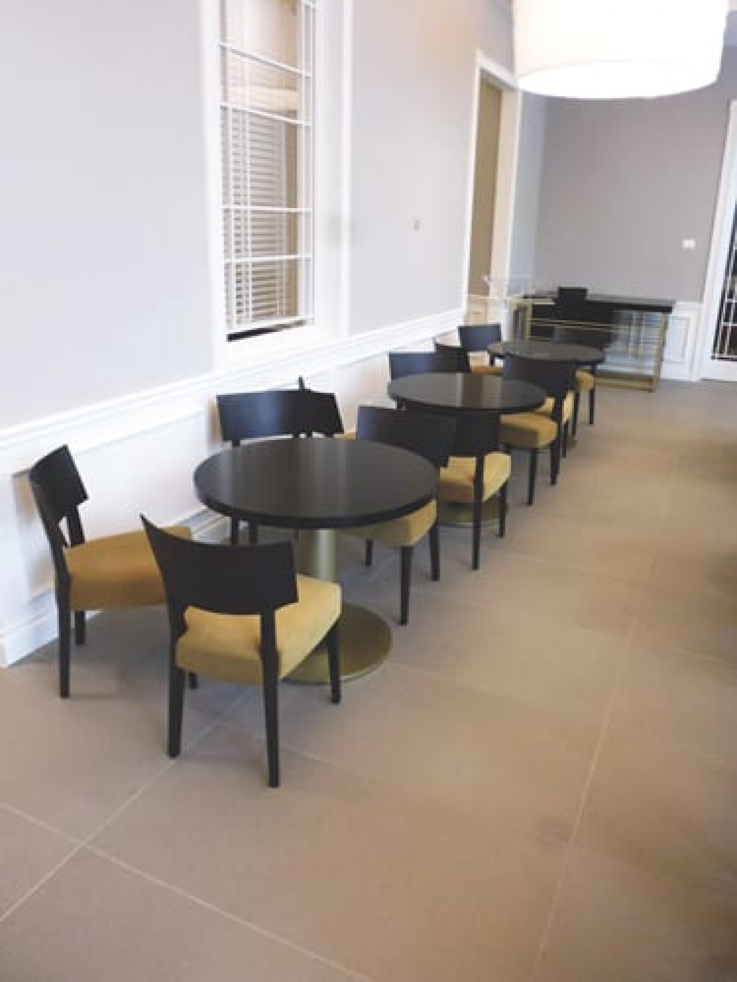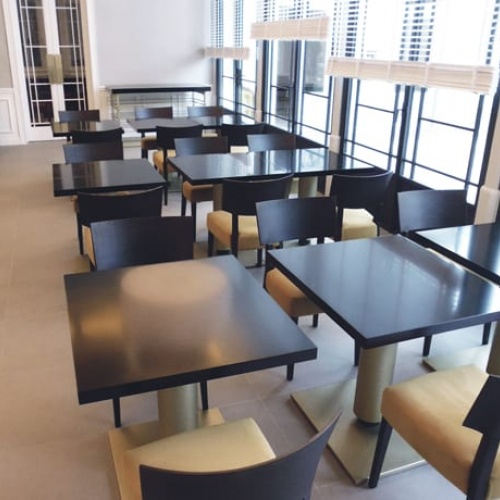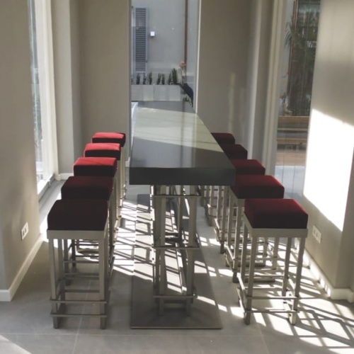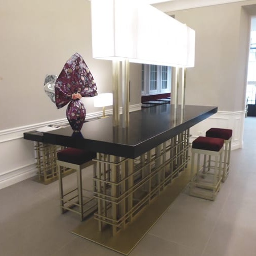 Sgabelli, tavoli e consolle sono stati progettati e realizzati per integrarsi e dialogare perfettamente con lo stile raffinato dell’hotel, fra il classico e il moderno.